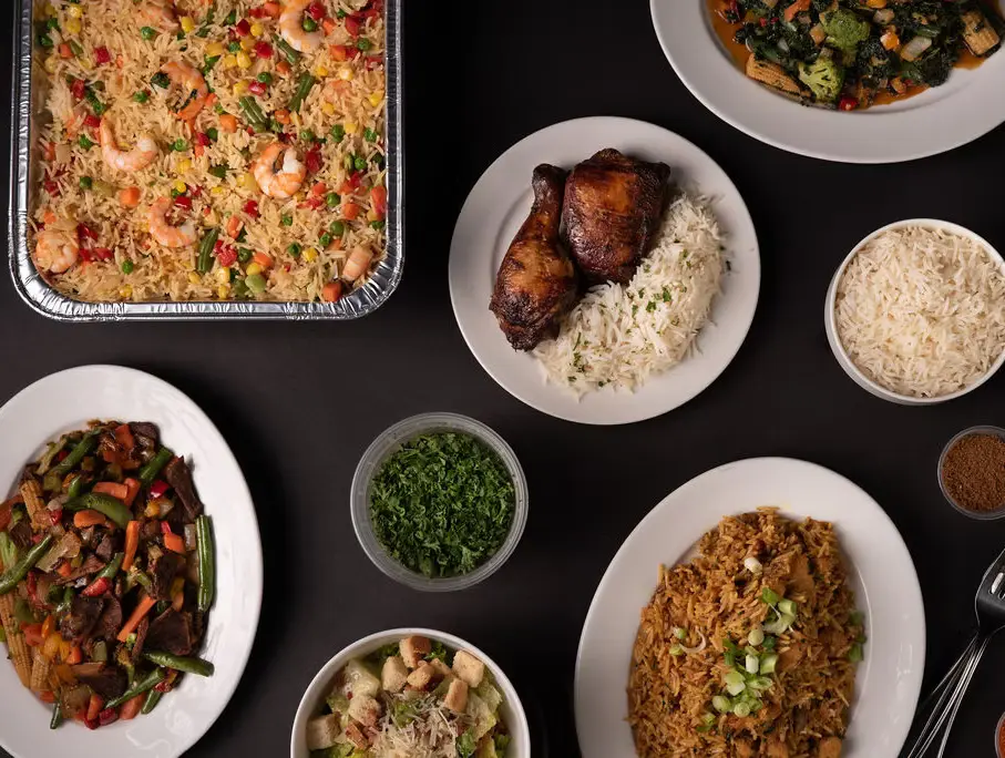 A vibrant and colorful rice bowl featuring fragrant basmati rice topped with a medley of fresh vegetables, tropical flavors, and your choice of protein. This fusion dish combines West African spices with fresh ingredients, creating a healthy and satisfying meal that's as beautiful as it is delicious.